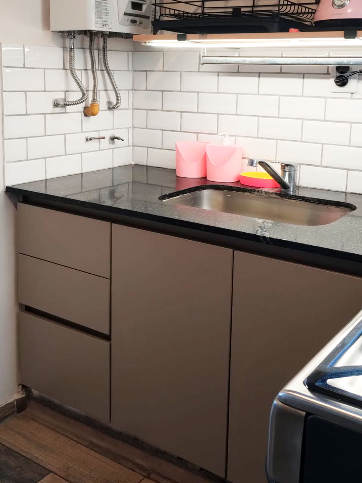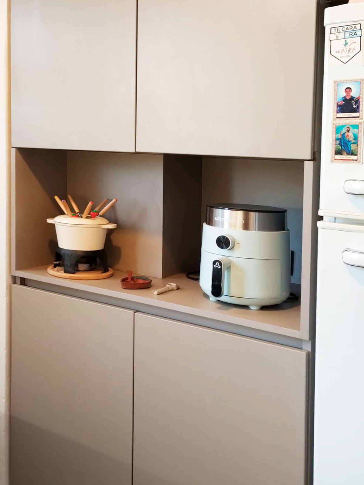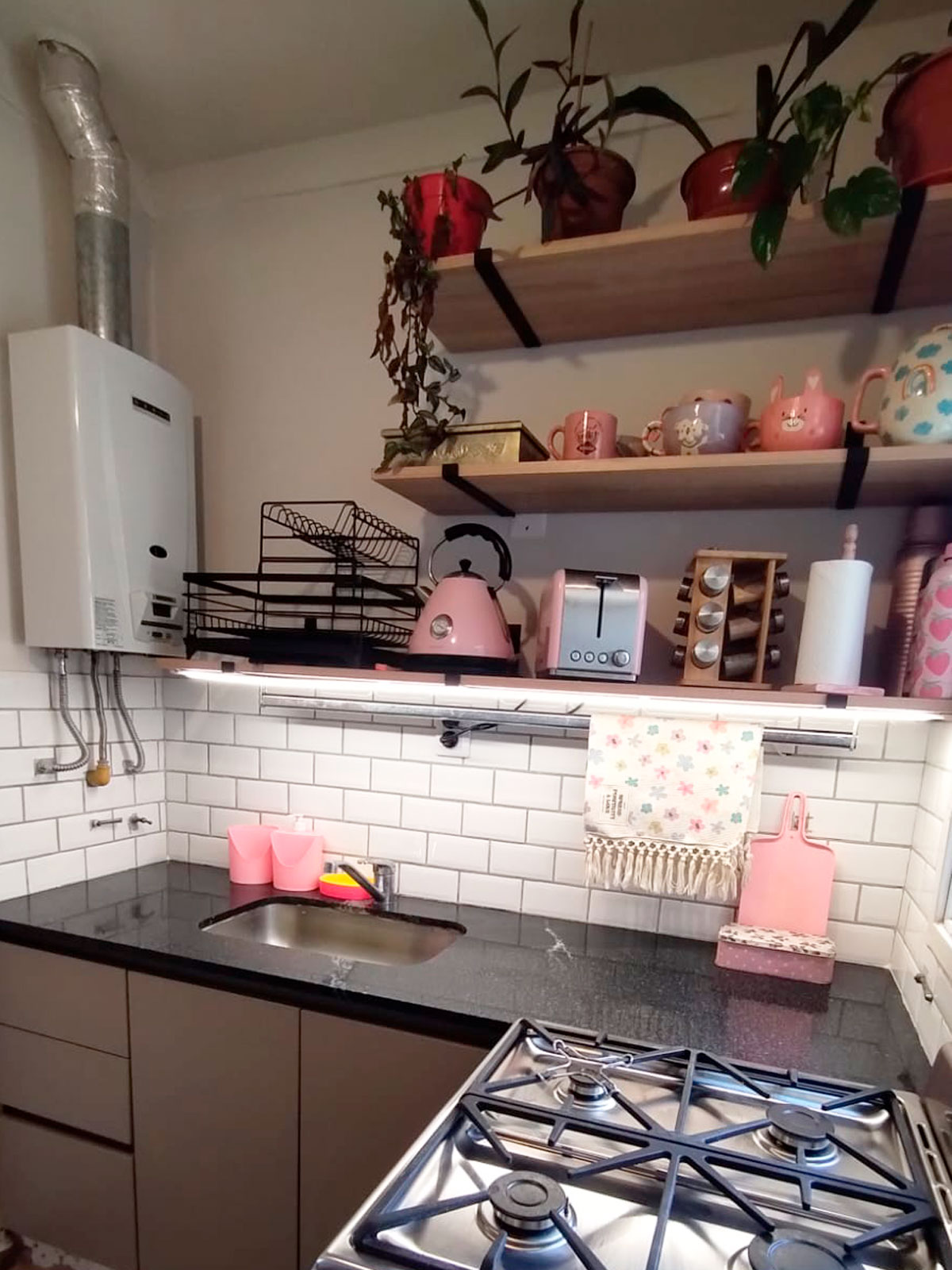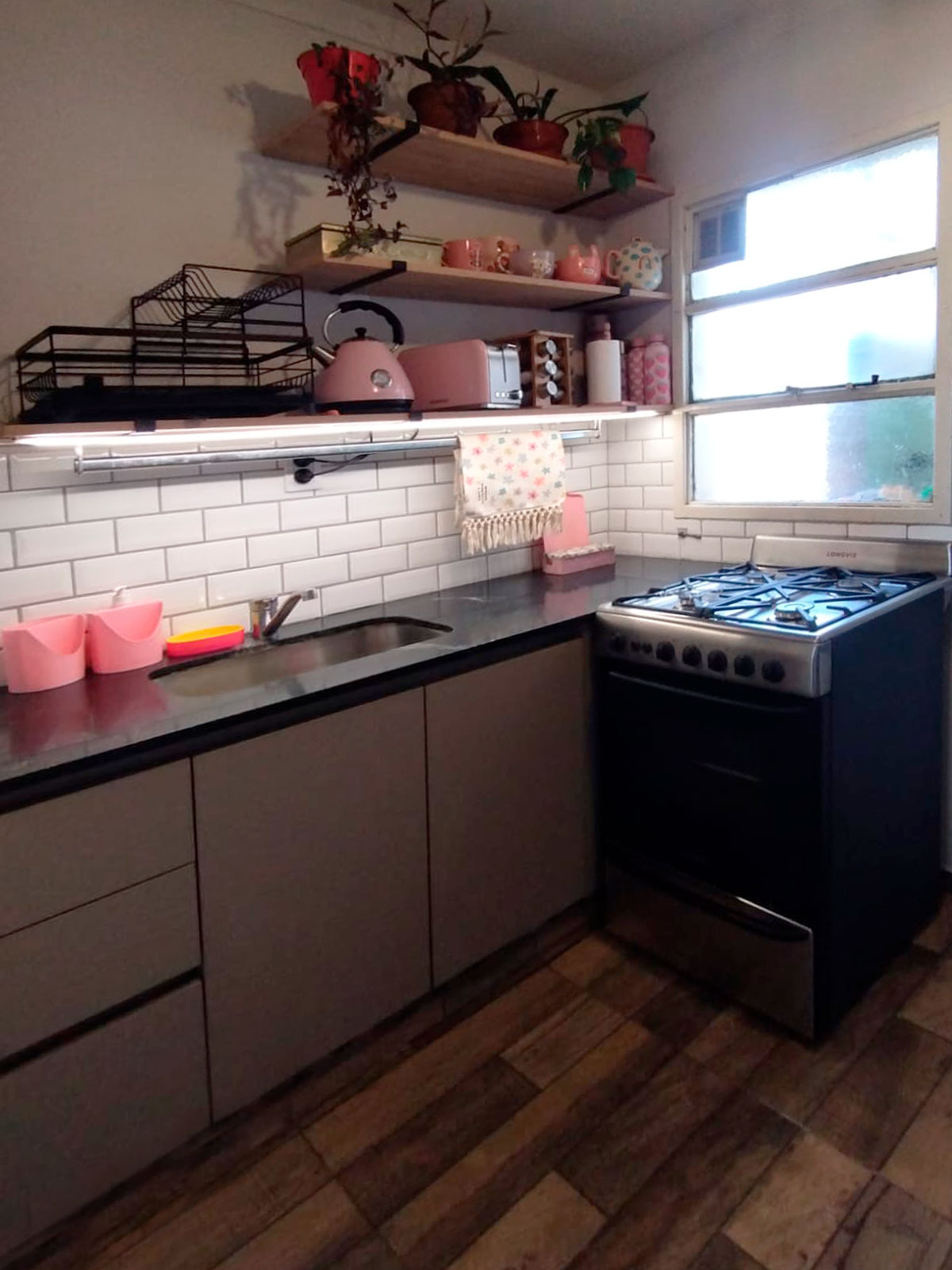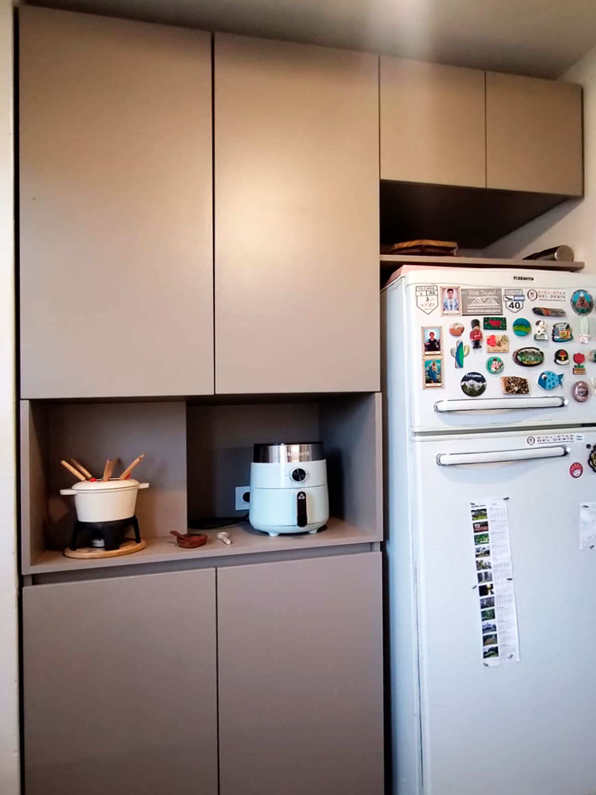 Diseño y provisión de cocina completa, módulos bajo mesada y nicho para heladera y microondas a medida, terminación melamina arcilla, estantes en paraíso lustre natural con iluminación led.