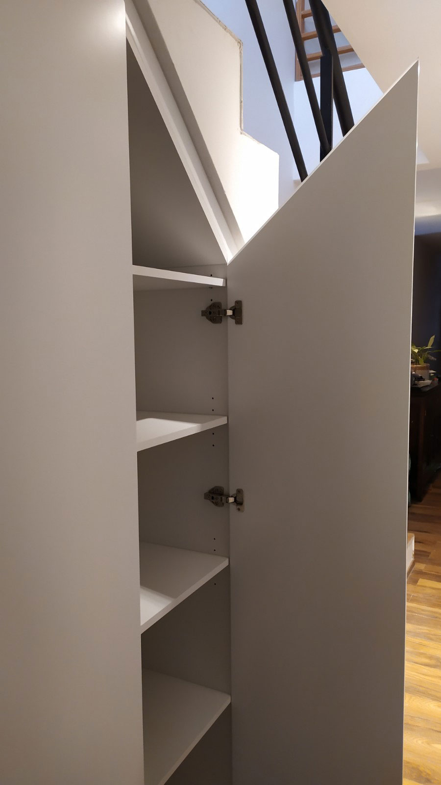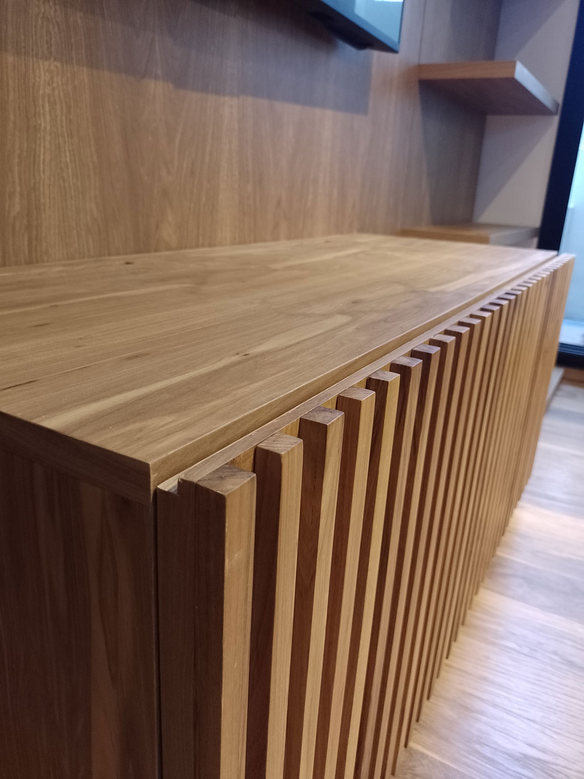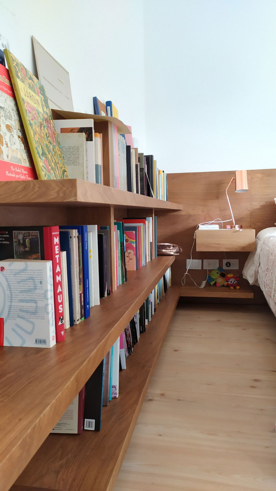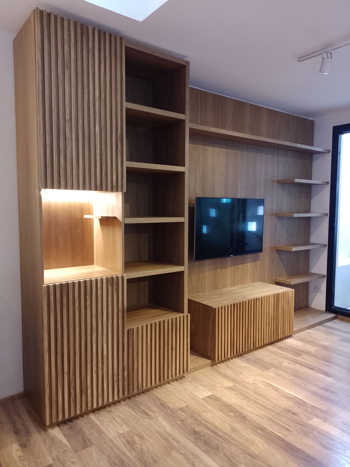 Diseño y provisión de mobiliario para TV y mueble para bar, guardado para bajo escalera, mueble respaldo de cama y biblioteca + panel para TV en habitación principal, interior de placard para nicho existente y placard con frentes laqueado para habitación infantil