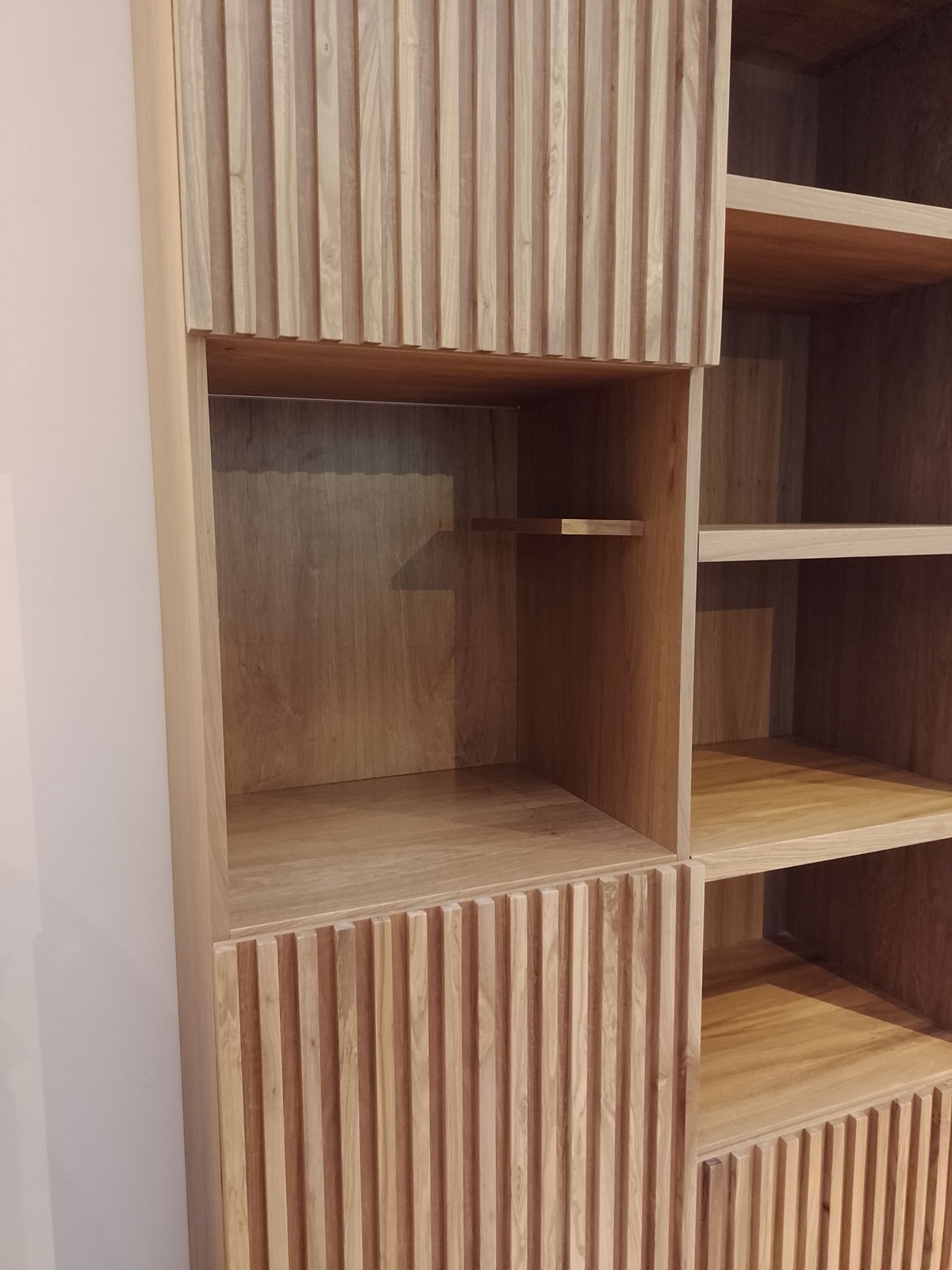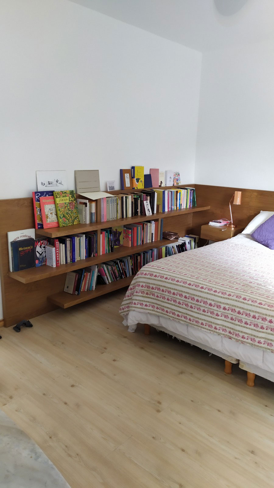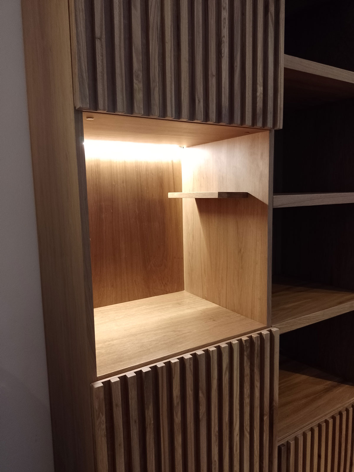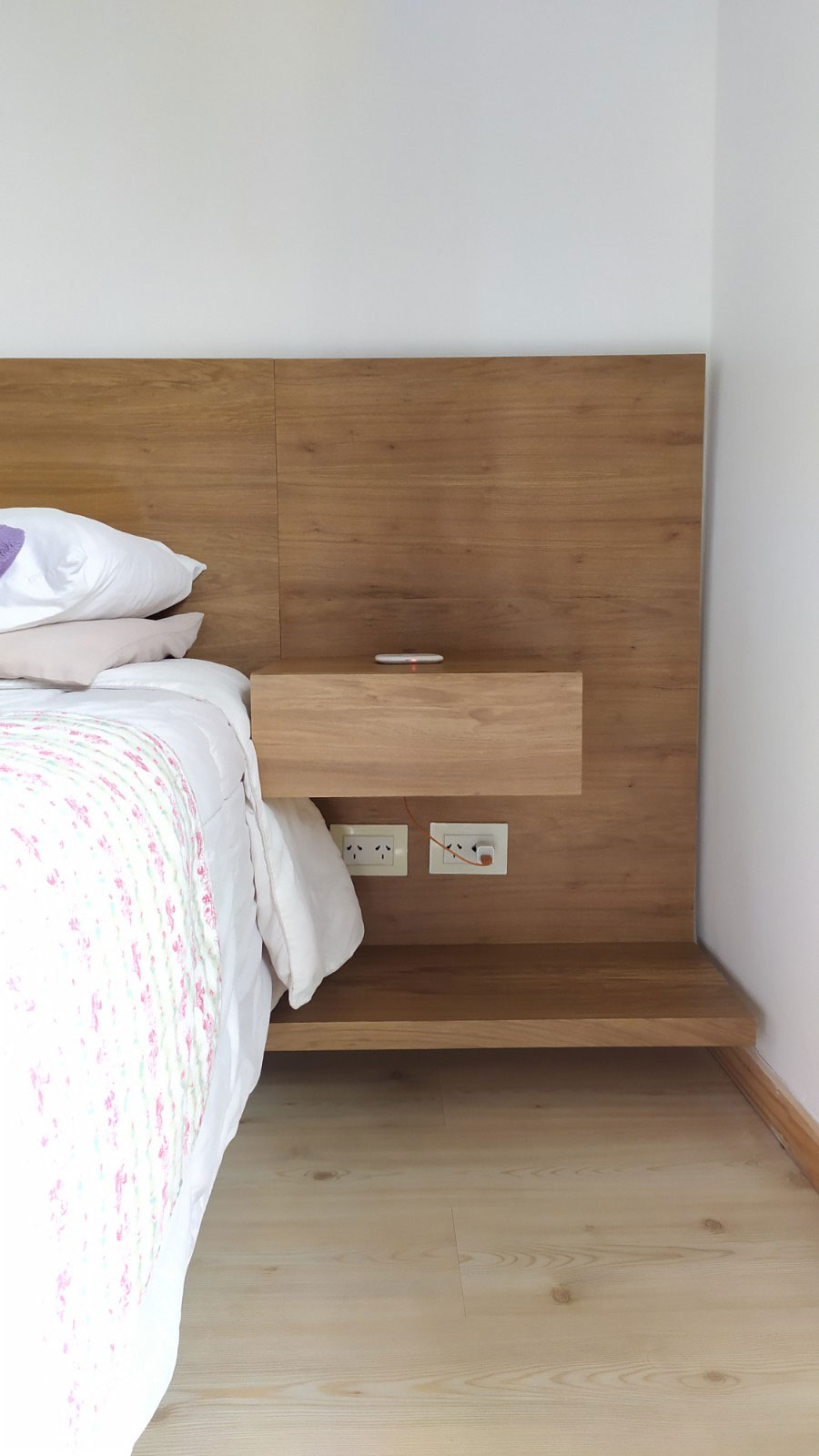 Diseño y provisión de mobiliario para TV y mueble para bar, guardado para bajo escalera, mueble respaldo de cama y biblioteca + panel para TV en habitación principal, interior de placard para nicho existente y placard con frentes laqueado para habitación infantil