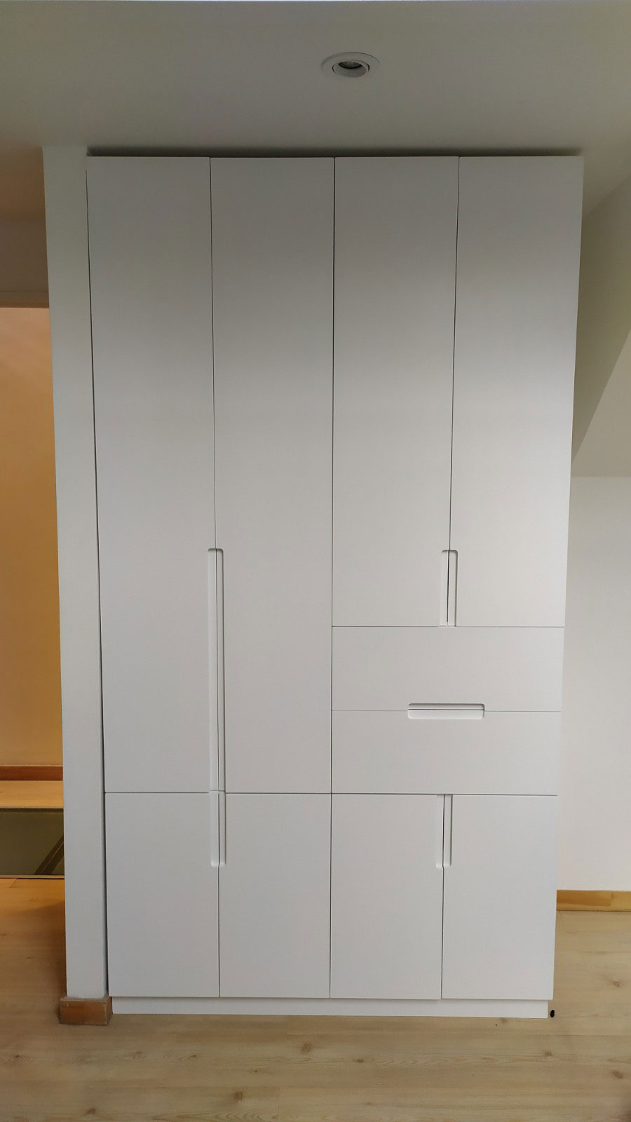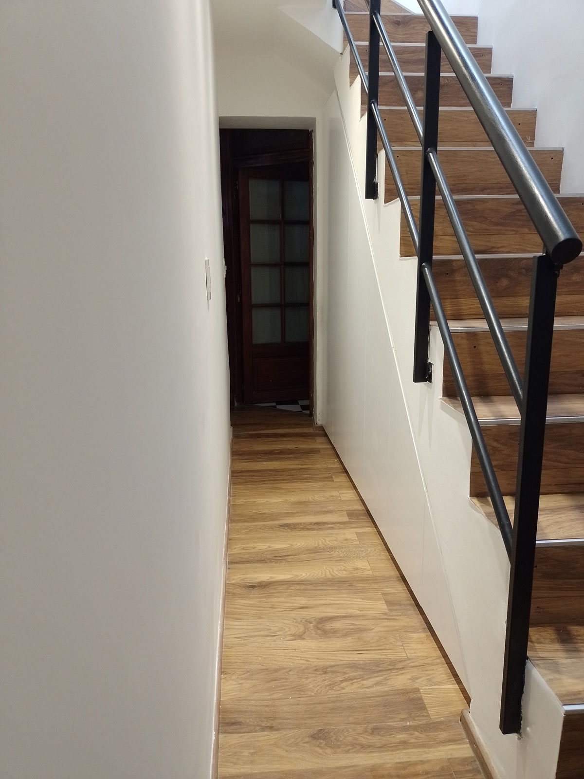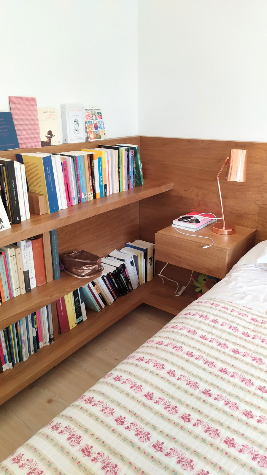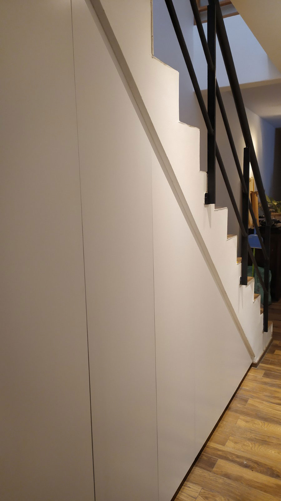 Diseño y provisión de mobiliario para TV y mueble para bar, guardado para bajo escalera, mueble respaldo de cama y biblioteca + panel para TV en habitación principal, interior de placard para nicho existente y placard con frentes laqueado para habitación infantil